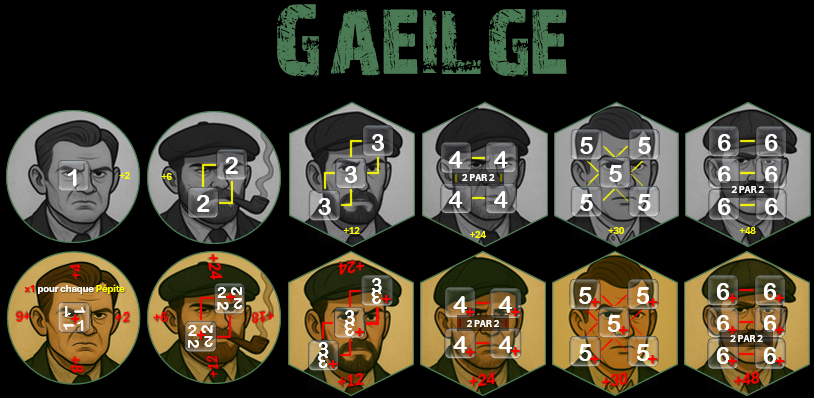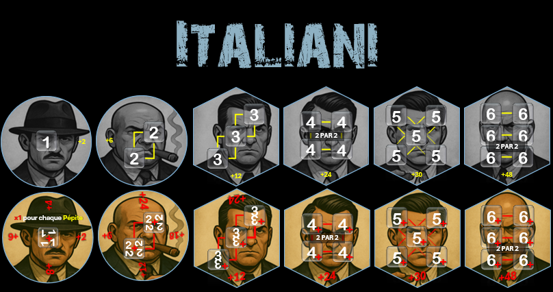 - 6 plateaux de jeux représentant 6 familles et composés de 17 tuiles (Soit 108 pièces) : • 6 tuiles Gangsters • 4 tuiles Bonus • 6 cartes Gangsters • 1 tuile Level