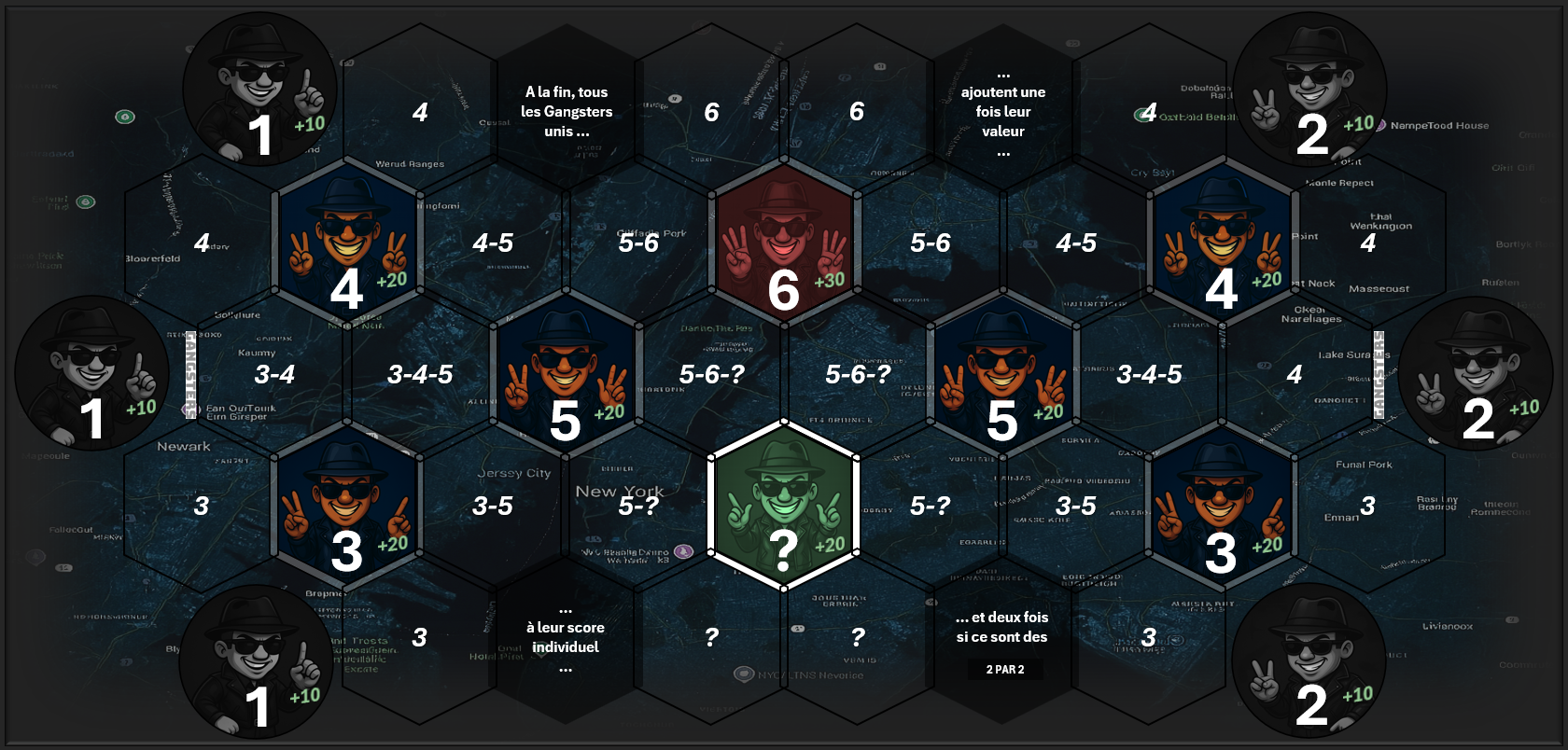 Auxquels il conviendrait d'ajouter le Bonus de Gangsters unis (+une valeur à tous les Gangsters contigus) = +8 points aux 4, +5 points aux 5 et +12 points aux 6.