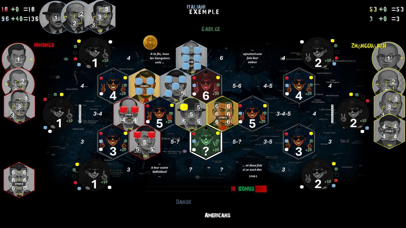 Auxquels il conviendrait d'ajouter le Bonus de Gangsters unis (+une valeur à tous les Gangsters contigus) = +8 points aux 4, +5 points aux 5 et +12 points aux 6.