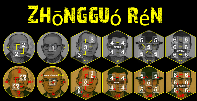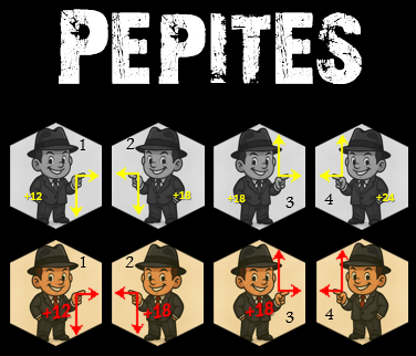 Lorsqu'un Gangster est sur sa face grisé, on utilise des pions jaunes; Lorsque le Gangster est recruté, il est retourné sur sa face active et peut ensuite être amélioré avec des pions rouges.
