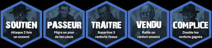 2. Tenter de renforer un ou plusieurs Gansters (présent(s) sur une case renforcement) = lancer 1 dé + 1 dé par pion de renfort déjà présent sur le Gangster le plus fort : renforcer d'autant de pions que le nombre de dés obtenus lors du lancé et de même valeur qu'un des Gansgters en jeu