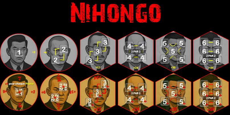 Toutes les tuiles sont réversibles avec une face inactive (noir et blanc) et une face active (couleur).