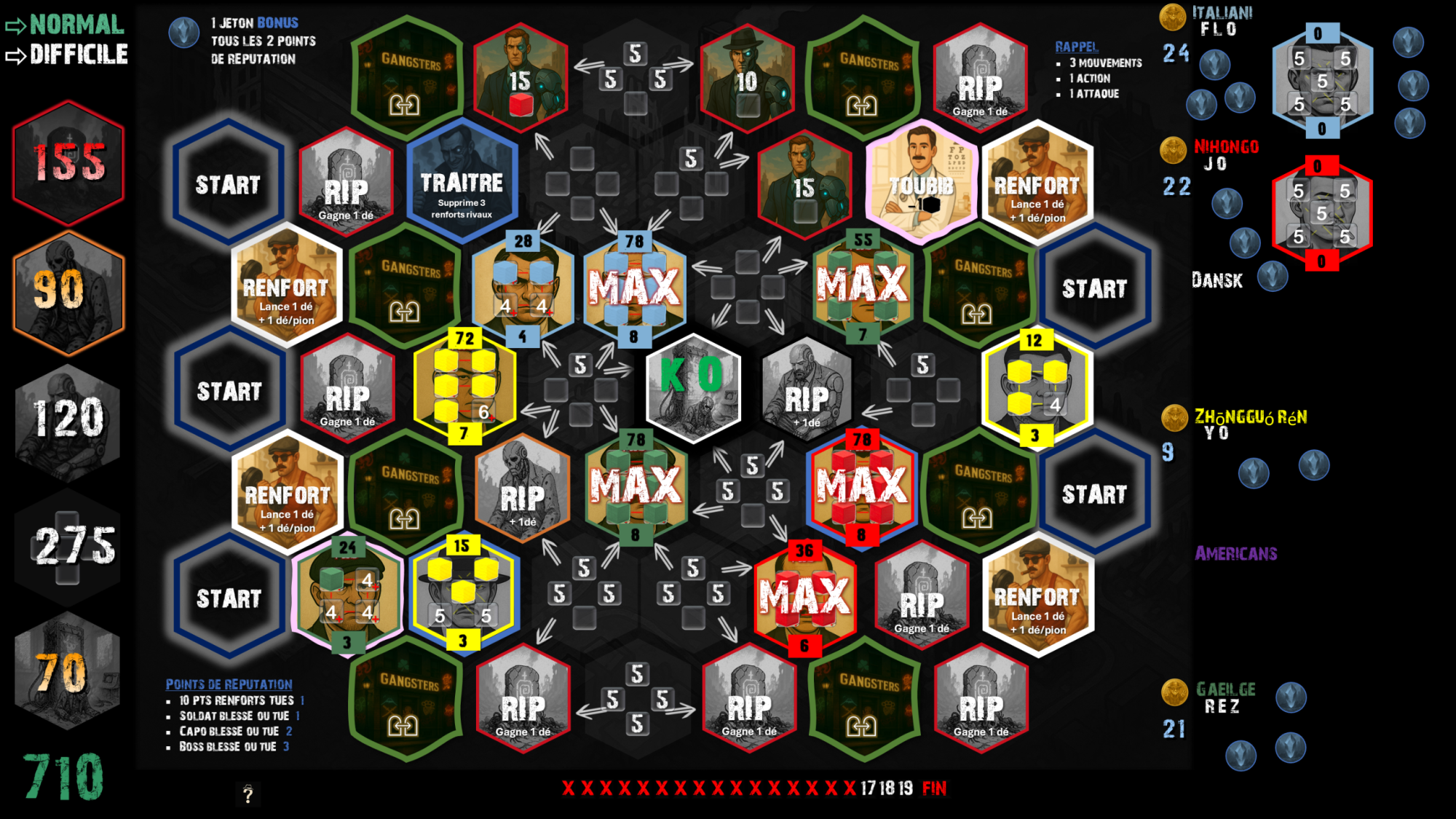 - en haut de la tuile, son score de combat de base (Nombre de pions x Valeur du Gangster),