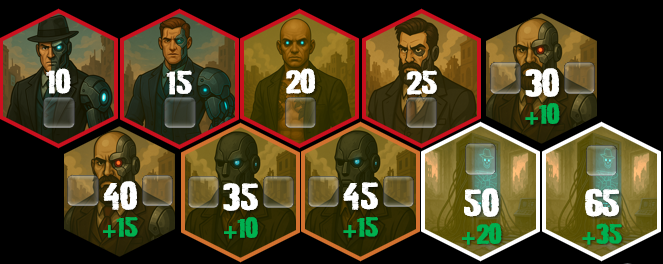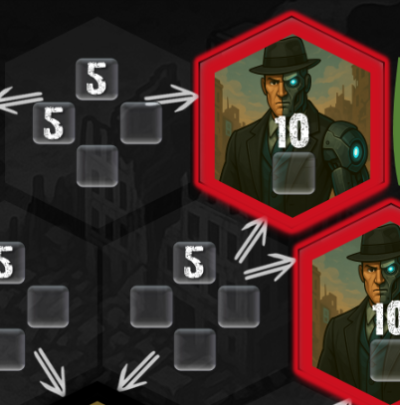 Toujours dans le même exemple, l'ennemi attaqué est le Gangstéroïde ci-dessous (en haut de l'image). Il a une défense de base de 10 points à laquelle s'ajoute le cumul des renforts adjacents, soit les deux 5 de gauche et le 5 en bas à gauche, soit un total de renfort de 15 points.