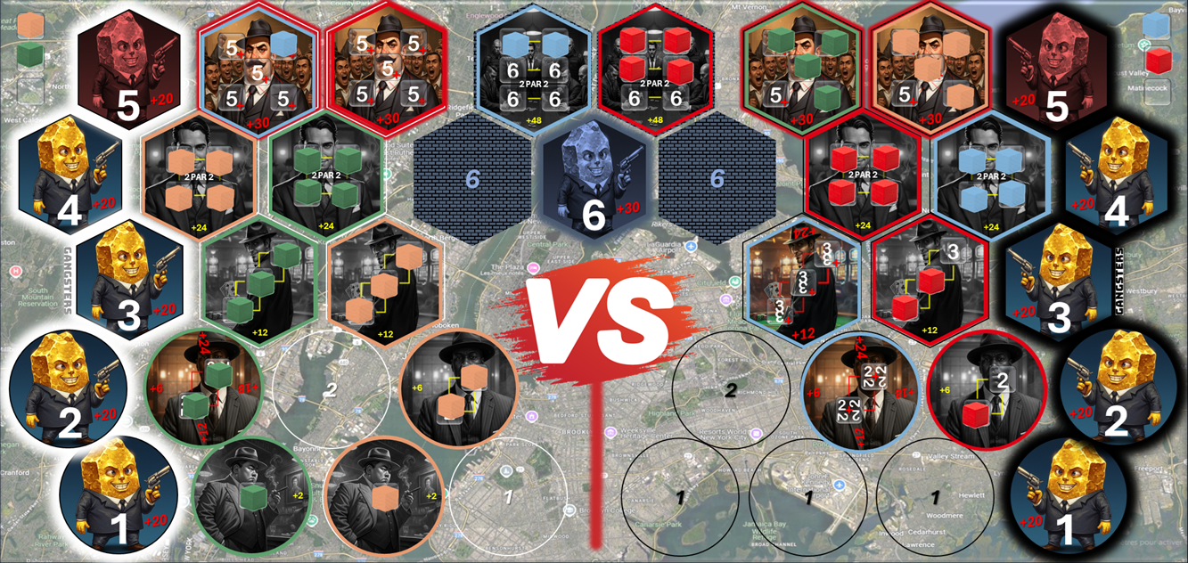 Il recrute alors un Gangster ou en améliore/renforce un déjà présent sur le plateau, de façon identique au jeu de base Gangsters. Chaque joueur est représenté (tuiles + pions) par une couleur différente. Les 2 dés restants peuvent être choisis par ses coéquipiers selon le nombre de joueurs.